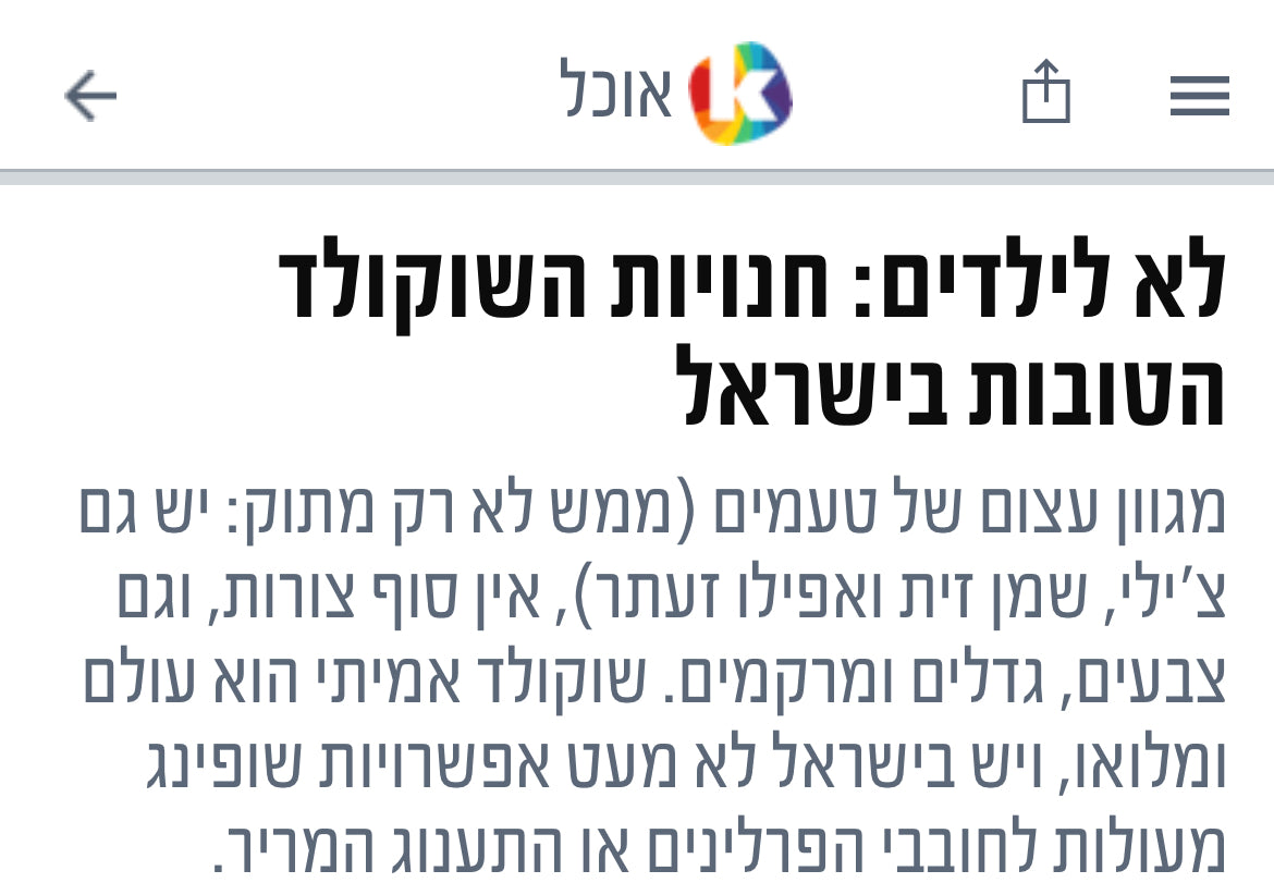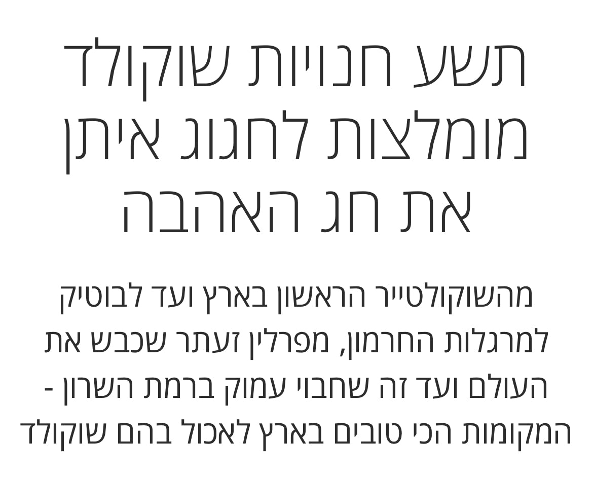 אנחנו ברמת השרון משנת 2014, בחנות קטנה שהחליפה את השוקולטרי הראשון שלנו, שהיה סוד כמוס של רמת שרונים חובבי שוקולד ברחוב צדדי בעיר. מבוקר עד ערב אנחנו ממלאות את המדפים הצפופים ואת הויטרינה האלגנטית בשוקולד ופרלינים מכל כך הרבה סוגים. גם המשלוחים יוצאים מכאן, ומגיעים כמעט לכל הארץ, כולל בימי חמסין לוהטים ובימי גשם סוחף.